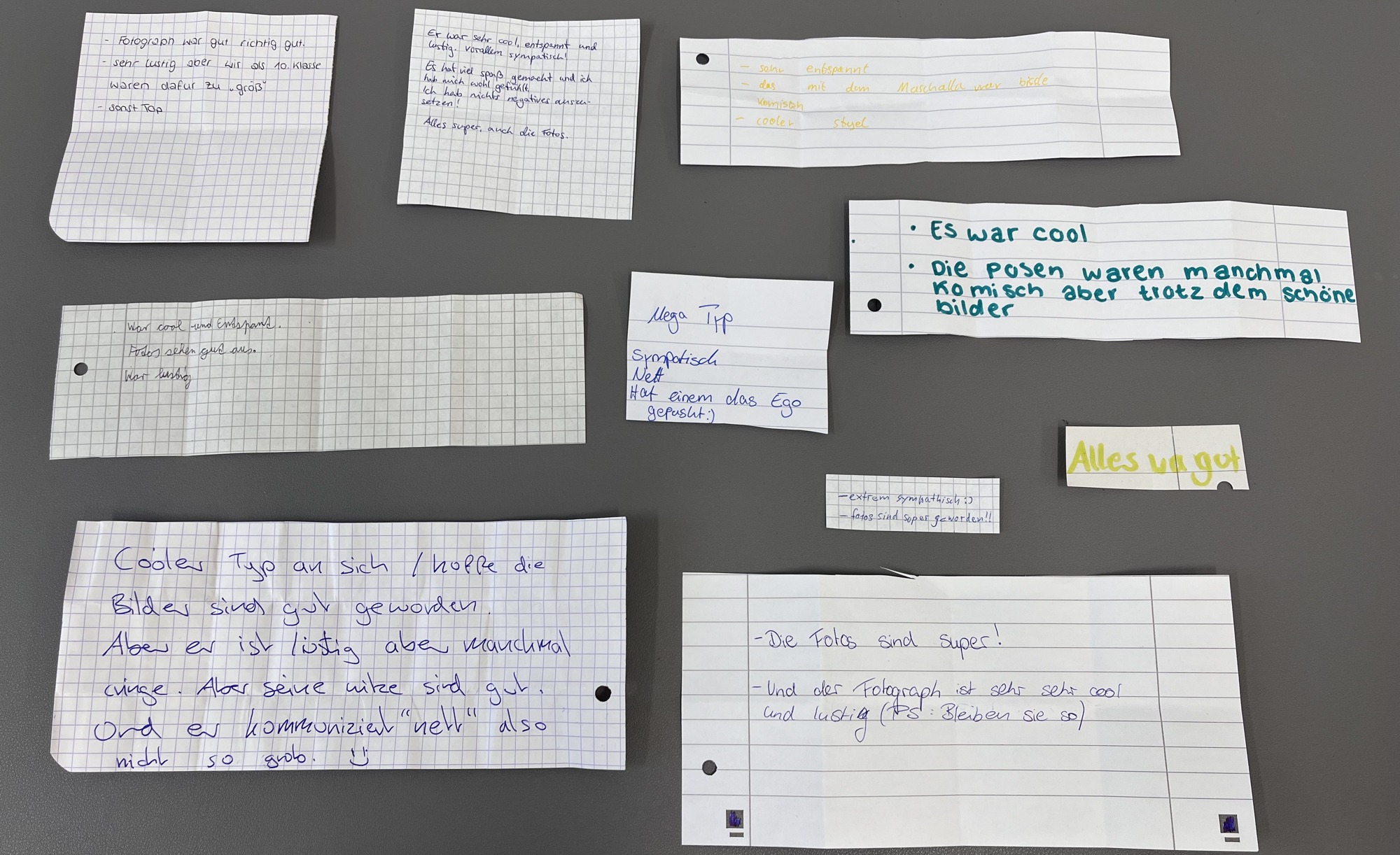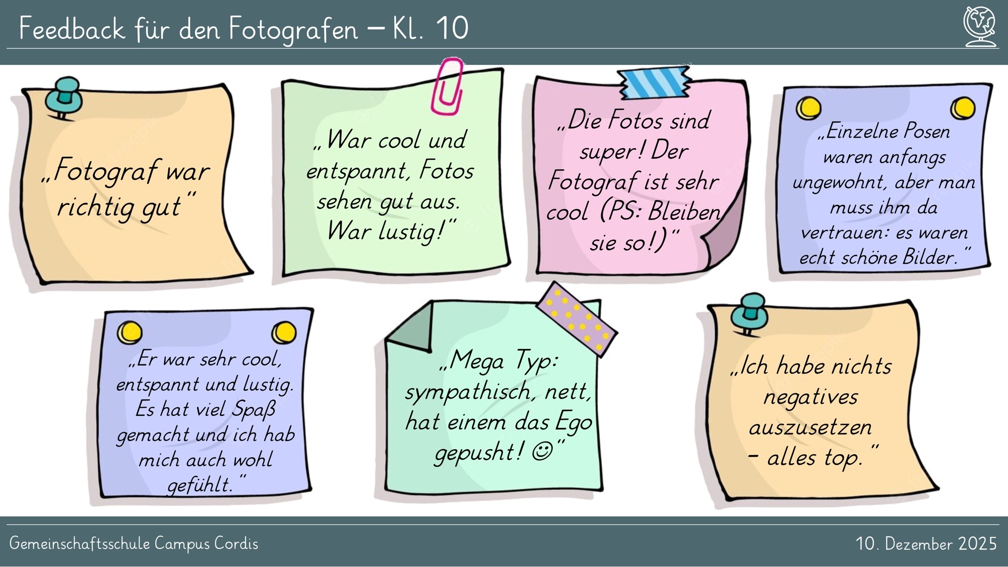 Hintergrund: Nach einem Fotoshooting von Marius Theßenvitz im Herbst 2025 an einer weiterführenden Schule entstand in einer 10ten Klasse die spontane Idee, ihre Rückmeldungen zu dem Fotoshooting zu sammeln, um diese dem Elternbeirat, anderen Schülern und deren Eltern zu zeigen, damit auch andere Klassen im kommenden Jahr an dem Fotoshooting in der Schule für die Schüler teilnehmen. Und dann schloss sich ein Lehrer den Schülern an … anbei alle Aussagen im O-Ton: